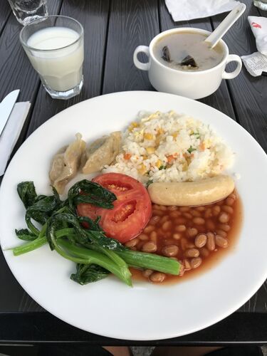 どもです。※ネット回線が牛歩状態でしたが、写真追加しました!今日は朝からバス移動、今いる場所と同じ北京市内だけど、チョット北に向かって行きます。いつもの通り、お粥からスタート!紅茶にケーキも摘んだり。良い天気なので、テラスで朝ご飯(´∀`)あら…