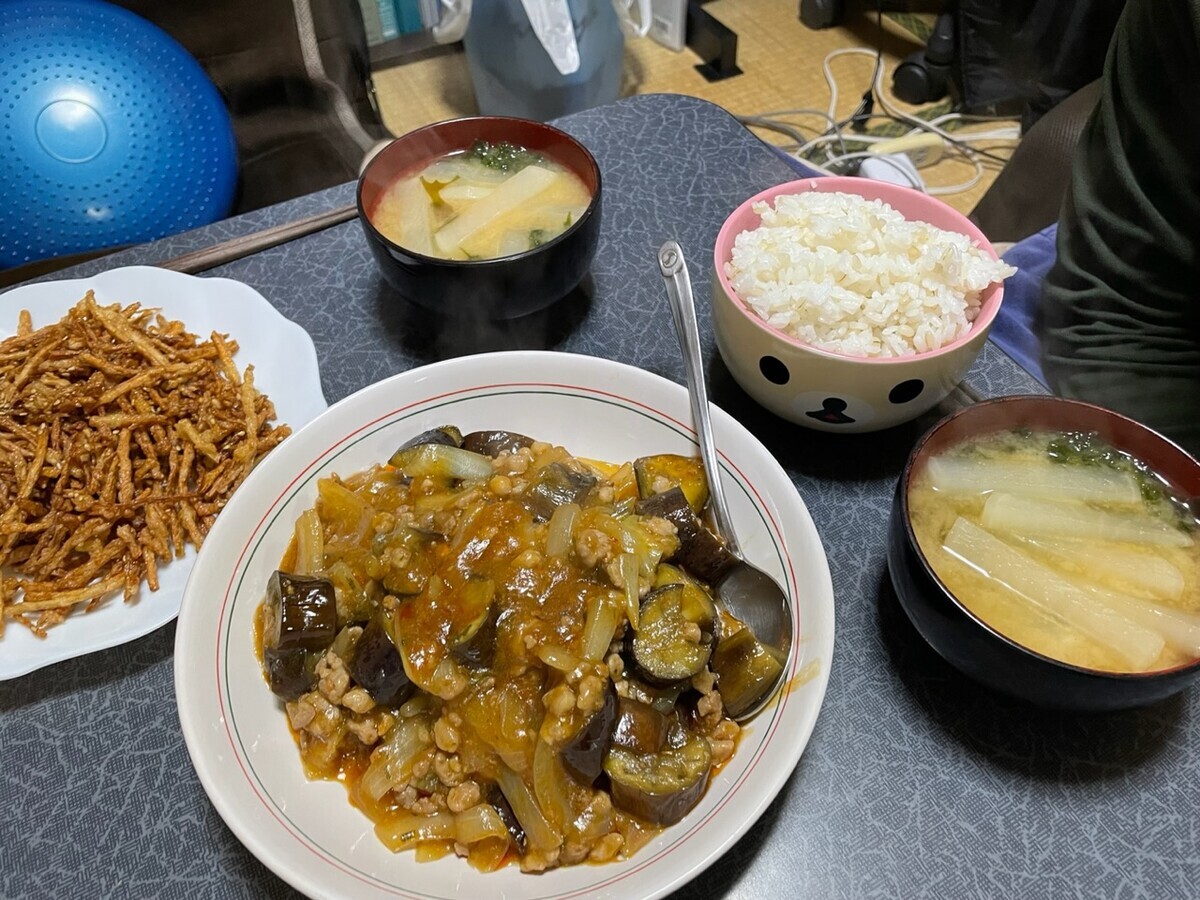 麻婆茄子!豚の荒挽肉を足して玉ねぎ入れたら美味しくできたw